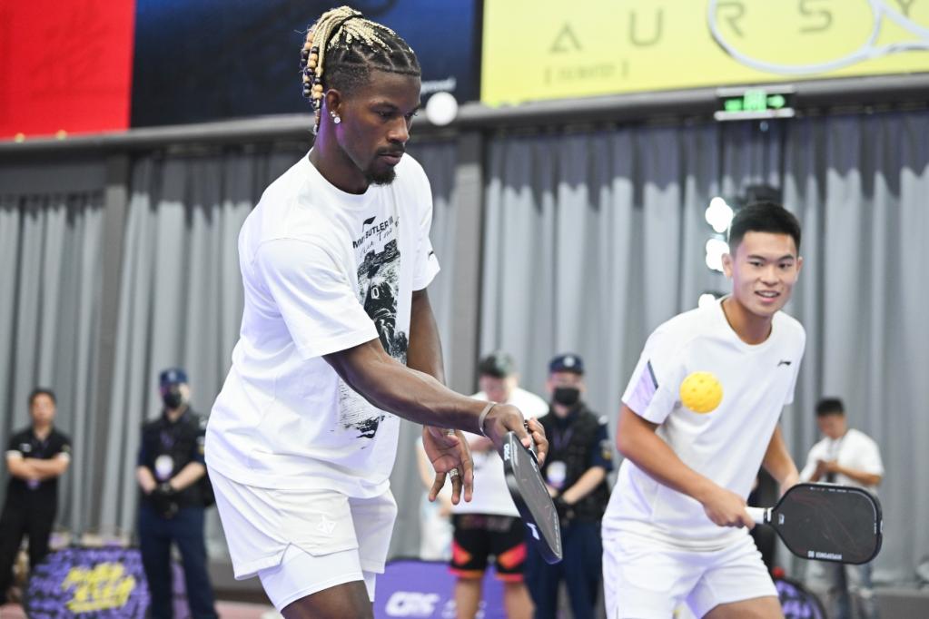 8月6日,吉米·巴特勒和蔡翔(右)在武汉参加匹克球表演赛。图片来源:中国匹克球巡回赛组委会